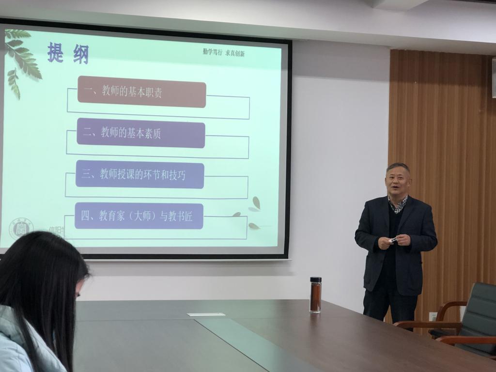 王强首先祝贺在座的新进青年教师成为一名光荣的高校教师,对大家选择太阳网集团8722大家庭表示欢迎。他指出“师者所以传道授业解惑也”,在传递知识的过程中起着乔梁作用。教师是一份伟大的职业,燃烧自己,点亮他人。接着,他从四个方面展开培训:一是教师的基本职责,熟悉职责,才能做好本职工作;二是教师的基本素养,高尚的素质,才能为他人树立好榜样;三是教师授课的环节和技巧,把握好课程程序与规则,才能保证课堂质量;四是教育家与教书匠的区别,努力提升自己,才能促进教学质量的提高。