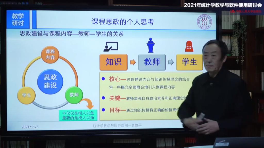 研讨会上,中国人民大学统计学院贾俊平副教授以“统计学教学与软件使用”为题作了专题报告,他结合自己多年来从事统计学教学和研究的经验,围绕新时代背景和应用人才培养目标下,高校统计学课程教学如何更好地开展,教学目标和考核方式如何设定,各种统计软件如何选择和使用,统计学教学与课程思政如何融合等几个方面进行了细致的讲授。