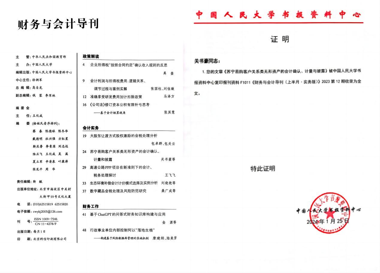 太阳网集团tcy8722青年教师关书豪的学术论文《苏宁易购客户关系类无形资产的会计确认、计量与披露》被中国人民大学复印报刊资料《财务与会计导刊》全文转载,原论文发表于核心期刊《中国注册会计师》杂志。