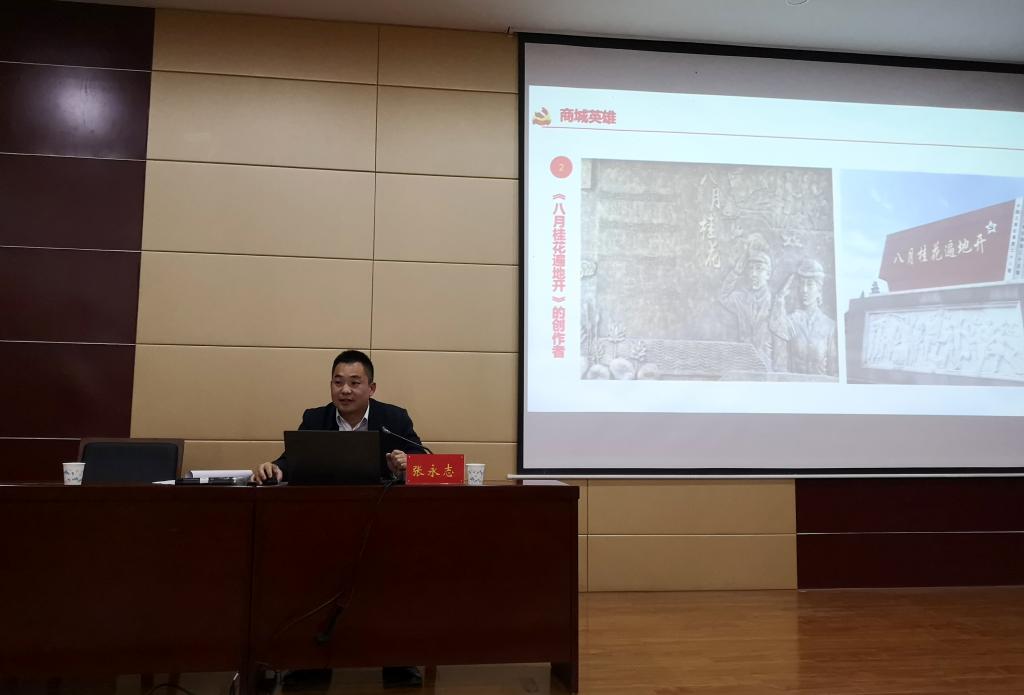 张永志从商城县在鄂豫皖革命根据地的特殊地理位置讲起,商城县建立了河南省第一个县级苏维埃政权——商城县苏维埃政府,是中国工农红军第四军建军地,是刘邓大军千里跃进大别山立足地,商城人民用巨大的牺牲为中国革命作出了积极的贡献,诞生了张祖谅等十二位开国英雄,有着光荣的革命历史。他重点介绍了商南起义,从血色的背景、突破的地点、缜密的部署、底层突破、组建军队、建立根据地等方面生动形象的讲述了商城儿女投身革命、英勇就义的英雄壮举,阐释了商南起义是继黄麻起义之后,大别山地区的又一次规模较大的武装起义。随后讲述了金刚台上的英雄事迹,通过一个个感人的故事,生动形象的讲述了商城儿女投身革命、英勇就义的伟大壮举,阐释了商城的革命对大别山区乃至整个中国革命都产生的深远影响。他说,商南起义不仅积累了宝贵的革命斗争经验,同时也深刻诠释了“坚守信念,胸怀全局、团结奋进,勇当前锋”的大别山精神。最后,他希望全体师生党员要牢记初心、使命,铭记革命历史,传承红色基因,弘扬大别山精神,立足岗位,积极探索,为建设中国特色社会主义新时代做出新贡献。