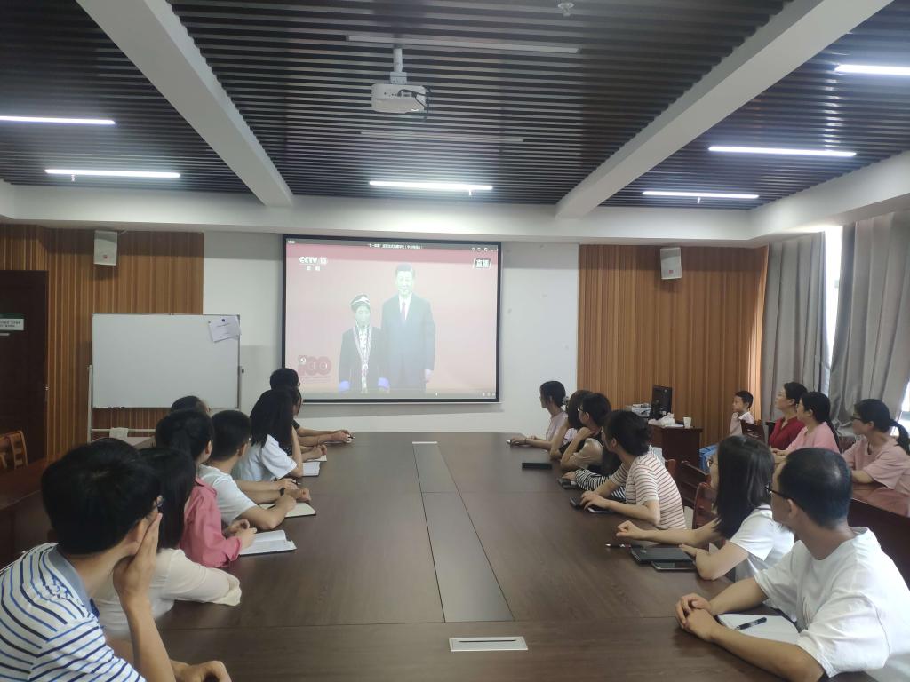 6月29日上午,太阳网集团tcy8722党总支书记胡秀云和全体教师在综合楼715会议室集体观看了中国共产党“七一勋章”颁授仪式现场直播。