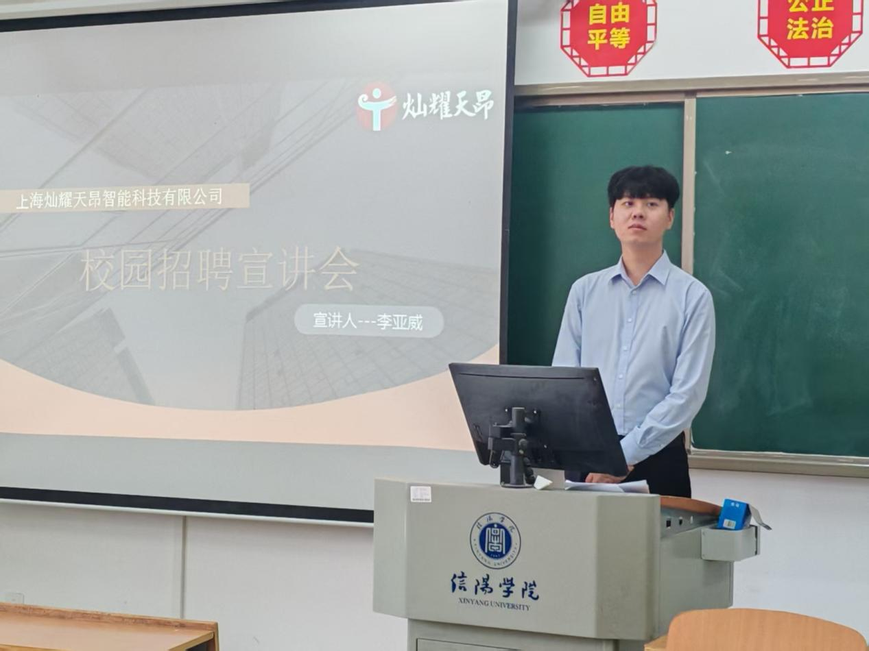 上海灿耀天昂智能科技有限公司以其独特的企业文化、创新前沿理念、全面清晰的员工晋升体系吸引了众多对科技行业感兴趣的学生,主讲人李亚威围绕企业招聘标准和企业工作模式两大模块,与同学们进展开深入交流,使其对未来的职业规划有了更清晰的认识。