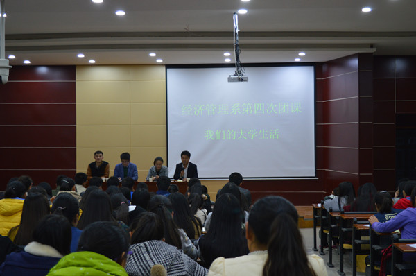 11月3日晚,经济管理系在图书馆学术报告厅召开“我的大学生活”主题团课。经济管理系第二届团总支学生会主席沈晋旭、优秀学生代表吴宗璇、张子阳、刘笑开出席了此次团课。团课由张琳主持。