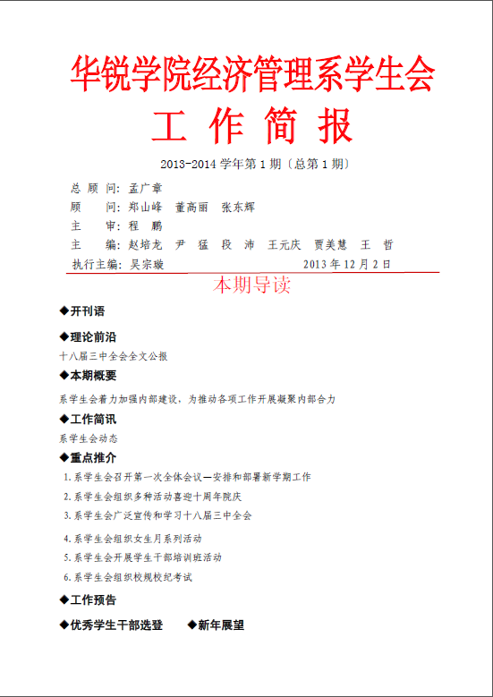 值此我院十年华诞,我系第一届团总支、学生会在党总支、团总支的指导下,编辑的《华锐学院经济管理系学生会工作简报》,供学生干部学习和交流之用。简报中,我们将近期学生会工作进行回眸和展望,在不足中总结教训,在成功中积累经验,以便于更好的开展好学生会工作,为华锐学院学生组织的建设和发展贡献力量。
