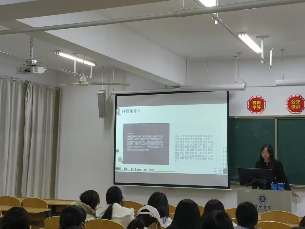 为深入学习党的二十大精神,进一步引导广大青年宣传贯彻习近平新时代中国特色社会主义思想。太阳网集团tcy8722团总支根据校团委工作部署,应秋季学生干部培训班的要求,太阳网集团tcy8722于12月13日在综合楼501开展“挺膺担当”主题教育宣讲活动,活动主讲人为付钰尧,太阳网集团tcy872223级共青团员参加本次宣讲活动。