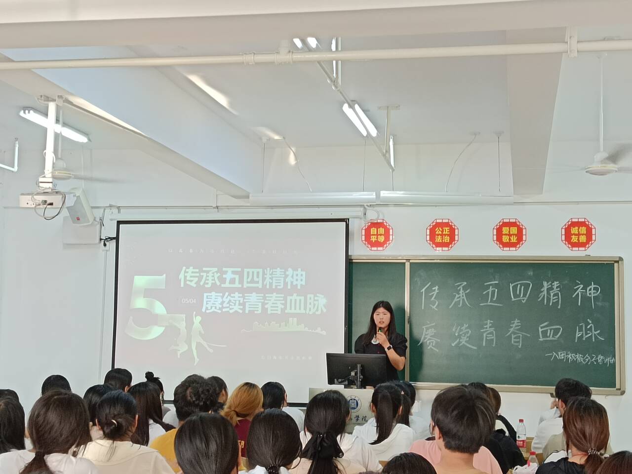 韩娟娟从五四运动的历史背景切入,结合《觉醒年代》短片向大家介绍五四运动中带领中国人民为拯救民族危亡、捍卫民族尊严、凝聚民族力量的青年面庞,由此讲述五四青年节的来历。随后,韩娟娟从“五四精神的具体内容内涵”、“学习五四精神的意义”和“新时代大学生如何继续弘扬五四精神”三个部分展开讲述。韩娟娟通过古今优秀青年的鲜活案例,让同学们深刻理解青年学生的责任与担当,鼓励大家以五四精神为指引,不断学习和继续弘扬五四精神,不负伟大时代,积极投身志愿服务和社会实践,凝聚青春磅礴力量。