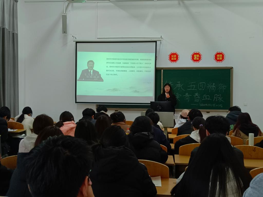 韩娟娟老师从五四运动的历史背景切入,结合《觉醒年代》短片,向大家介绍了五四运动中带领中国人民为拯救民族危亡、捍卫民族尊严、凝聚民族力量的青年面庞,从而引出了五四青年节的来历及深远意义。紧接着,韩老师围绕“五四精神的内涵”、“学习五四精神的意义”及“新时代大学生如何继续弘扬五四精神”等展开讲解。通过古今优秀青年的鲜活案例,韩老师不仅让同学们深刻体会到了青年一代的责任与担当,还激励大家以五四精神为指引,不断学习、传承并弘扬这一宝贵精神财富,不负伟大时代,积极投身于志愿服务与社会实践,凝聚青春的磅礴力量。
