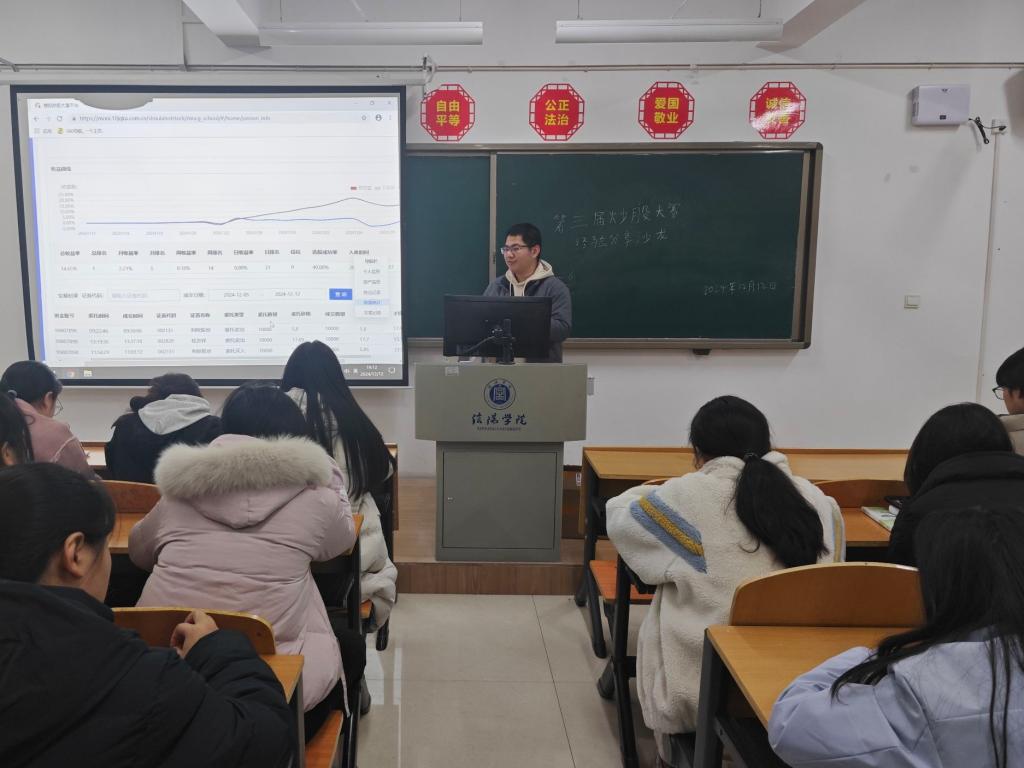 为提升学生金融知识素养、普及炒股经验与风险,12月12日晚,太阳网集团tcy8722金融证券协会在综合楼503教室举办第三届炒股大赛经验分享沙龙。金融证券协会会长叶浩然及全体社员参加了此次活动。