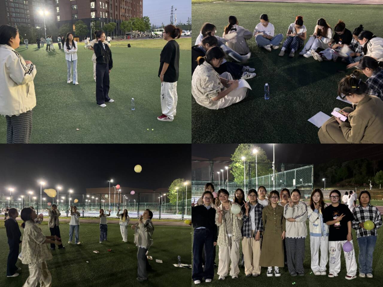 5月12日晚,孟涵老师以“向阳而生”为主题,在山下操场开展沉浸式心理团辅活动。活动以“青蛙跳水”接龙游戏破冰开场,迅速拉近彼此之间的距离。紧接着,在“眼疾手快”游戏中,双方选手争夺水瓶,紧张刺激的氛围瞬间点燃现场。在“艺术愈疗涂鸦”环节,学生们席地而坐,用手中画笔自由宣泄情绪。而“气球大作战”将活动推向高潮,两组队员在气球争夺战中你追我赶,踩爆气球的欢呼声此起彼伏,既考验了同学们的敏捷度又彰显了团队协作的力量。最后的“桃花朵朵开”环节,大家围坐畅谈,分享释放压力的真实感悟。整场活动在趣味互动中,帮助同学们在奔跑与欢笑中释放压力,深化了彼此之间的信任,提升了班级凝聚力。