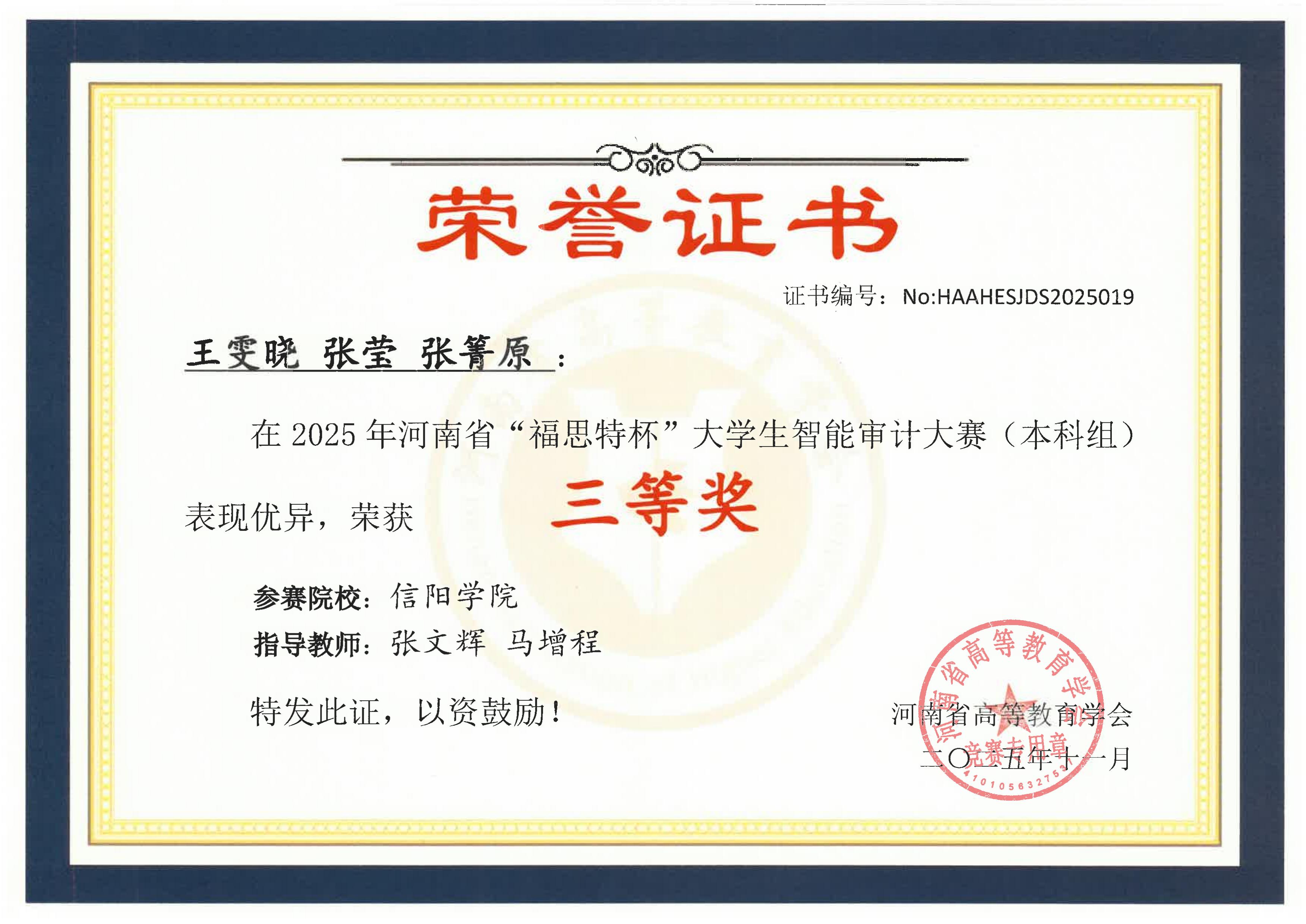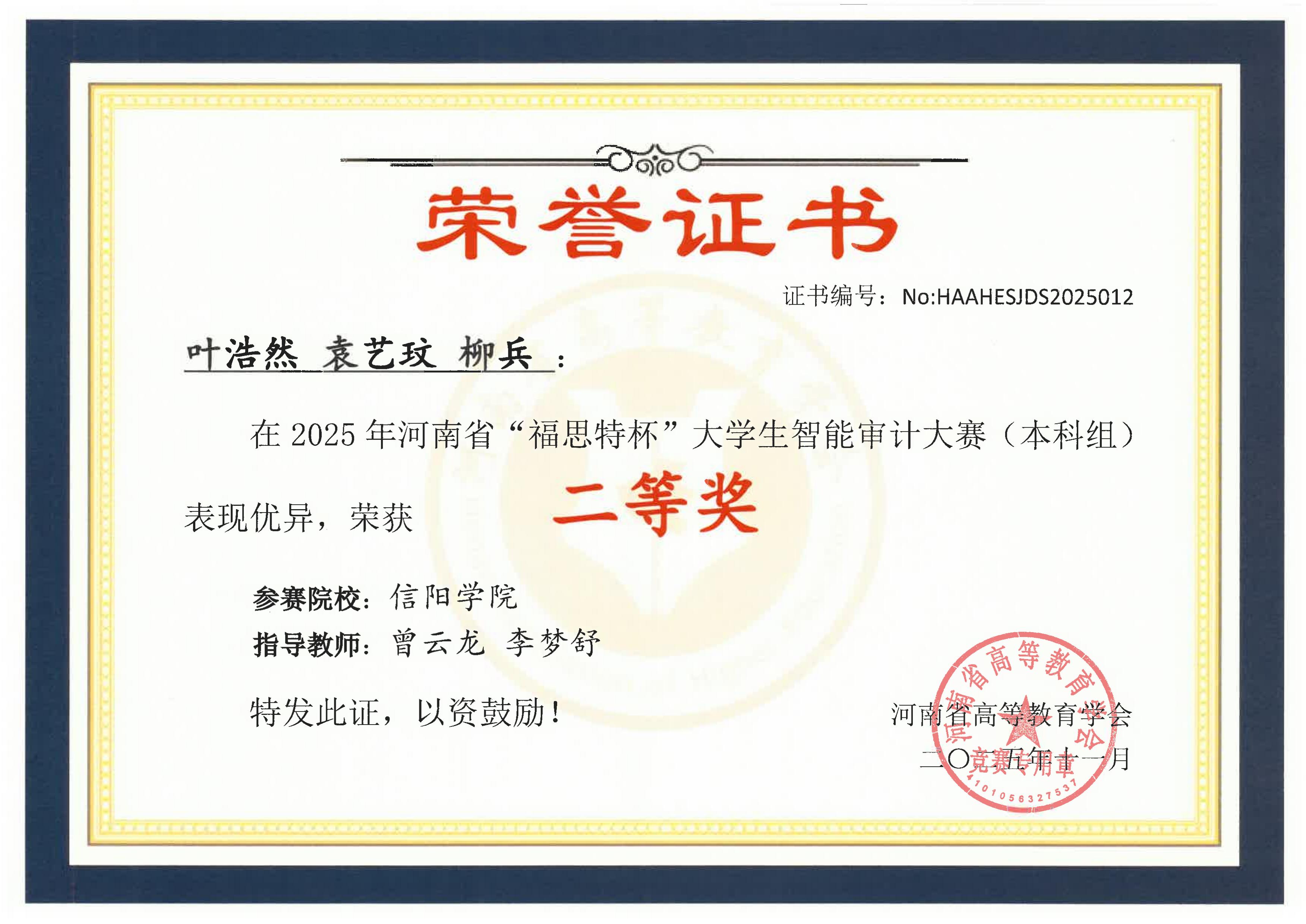 近日,2025年河南省“福思特杯”大学生智能审计大赛决赛获奖名单正式公布。太阳网集团tcy8722选派的两支参赛队伍凭借扎实的专业功底与出色的实战表现,在全省22所高校的200余名师生同台竞技的激烈角逐中脱颖而出,分别荣获大赛二等奖、三等奖,为学校赢得了荣誉,展现了学院人才培养的良好成效。