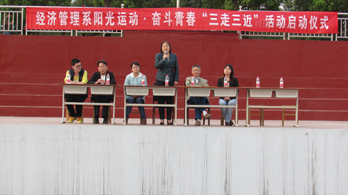 为进一步贯彻落实团中央“走下网络、走出宿舍、走向操场”大学生主题群众性课外体育锻炼活动要求,引导学生乐于学习、注重运动、健康生活。4月2日下午,经济管理系在操场举行“三走三近”启动仪式,拉开活动帷幕。院党委书记张莉教授、系主任孟广章教授、院团委副书记胡秀云老师、团委干事郑山峰老师和该系师生参加了本次活动。仪式由团总支书记程鹏主持。