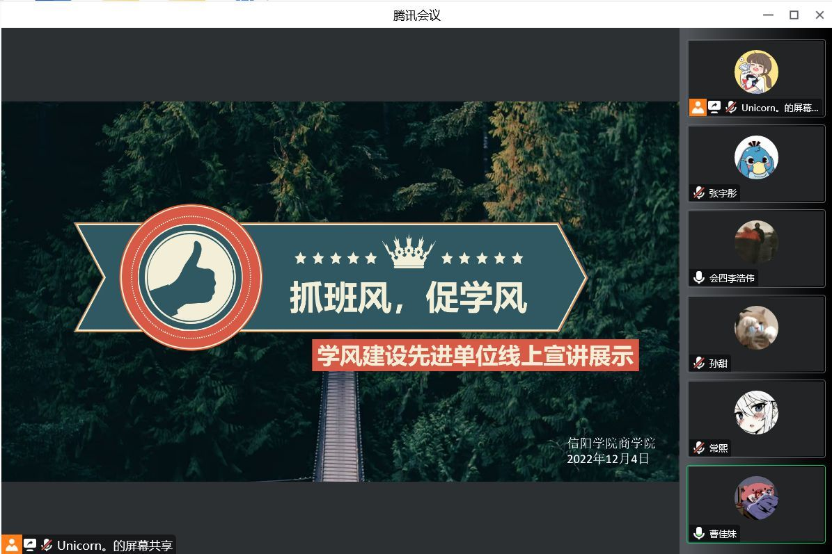 首先由2021-2022学年学风建设先进单位评选中获奖的宿舍、班级代表人依次进行线上宣讲。2020级会计四班的班长李浩伟、2021级财务管理二班的班长范新柯、18号公寓楼寝室长曹佳妹分别代表各自班级宿舍进行汇报,本次学风建设先进单位中的获奖集体学习氛围浓厚,学习风气良好,他们中每个人都展示出了时代新青年的青春色彩、青春活力。养成了“自主、遵规、勤学、自信、活泼、自由、团结”的集体精神,是全员同学学习的榜样。活动的最后,花端阳老师鼓励同学们要养成良好的学习生活习惯,奋力拼搏,希望越来越多的班级能成为学风建设先进单位。