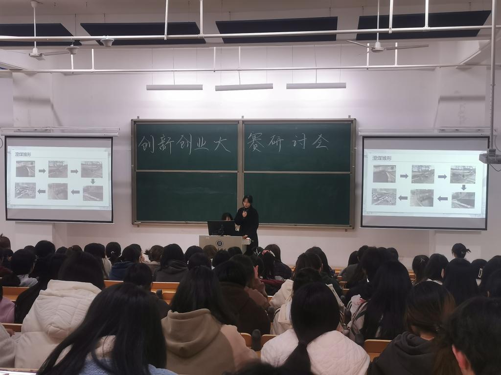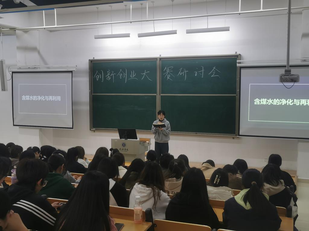 2022年“挑战杯”河南省大学生创业计划竞赛获奖团队代表李睿雅向大家展示了他们创新创业比赛项目——含煤水的净化与再利用。让学生们更加深刻了解到比赛的形式与内容。