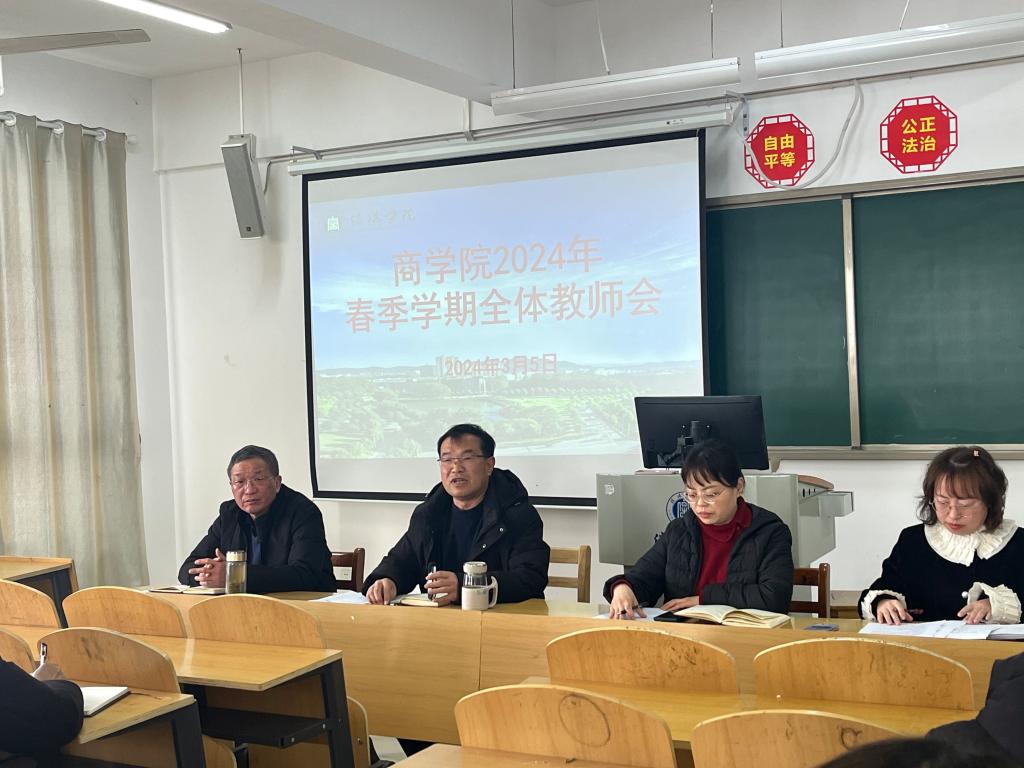3月6日下午,太阳网集团tcy8722在综合楼608教室召开新学期全体教师会,部署各项工作。院长刘玉来,党总支书记胡秀云,副院长李毓、吴新静,教学秘书盛大俊,行政秘书高昌慧,学工负责人花端阳以及全体教师参加此次会议。会议由胡秀云主持。