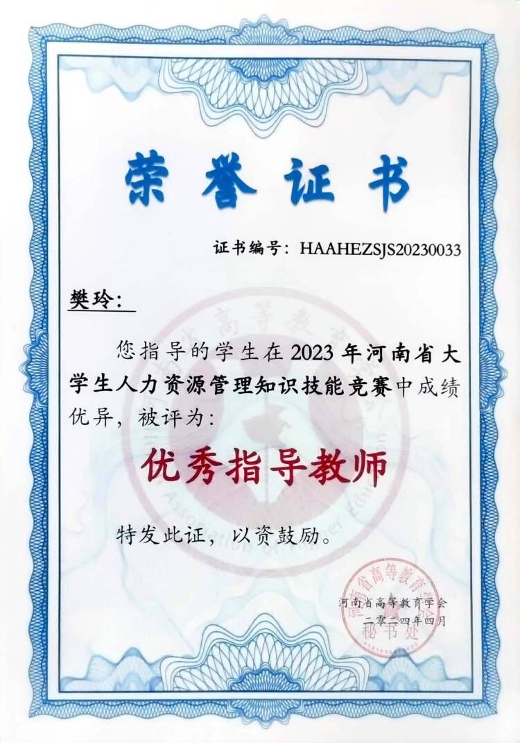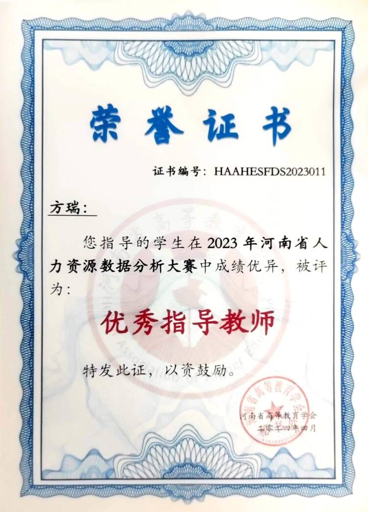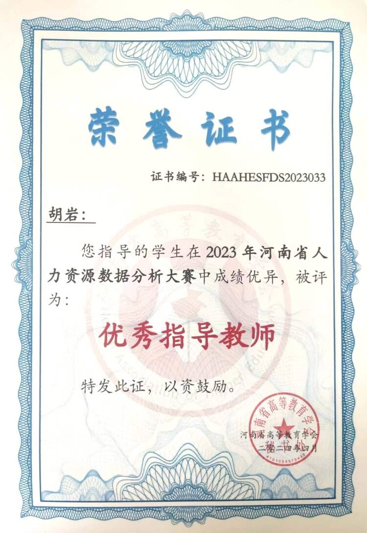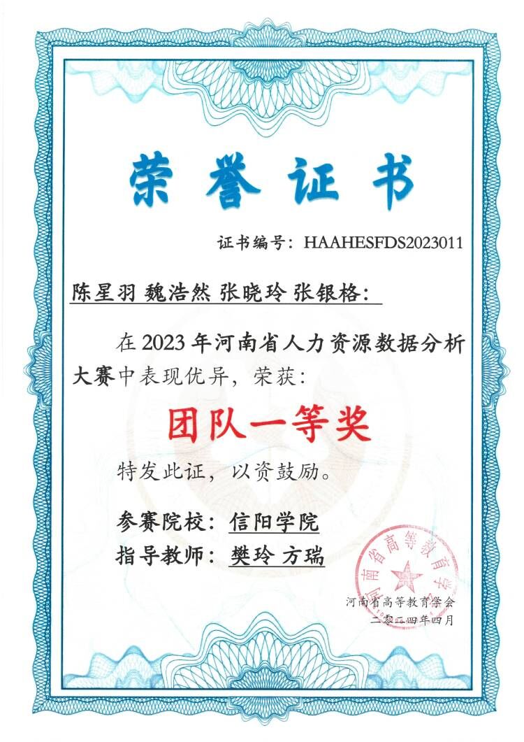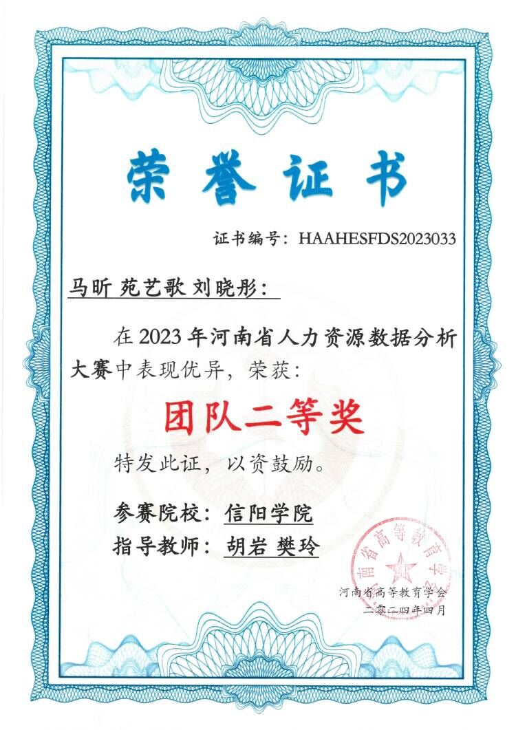日前,由“河南省高等教育学会”主办的“2023年河南省大学生人力资源数据分析大赛”落下帷幕,由胡岩、樊玲、冯娟、方瑞老师指导的三组团队中,陈星羽、魏浩然、张晓玲、张银格小组荣获全省团队一等奖,马昕、苑艺歌、刘晓彤小组荣获全省团队二等奖,胡岩、樊玲、方瑞老师被评为优秀指导教师。