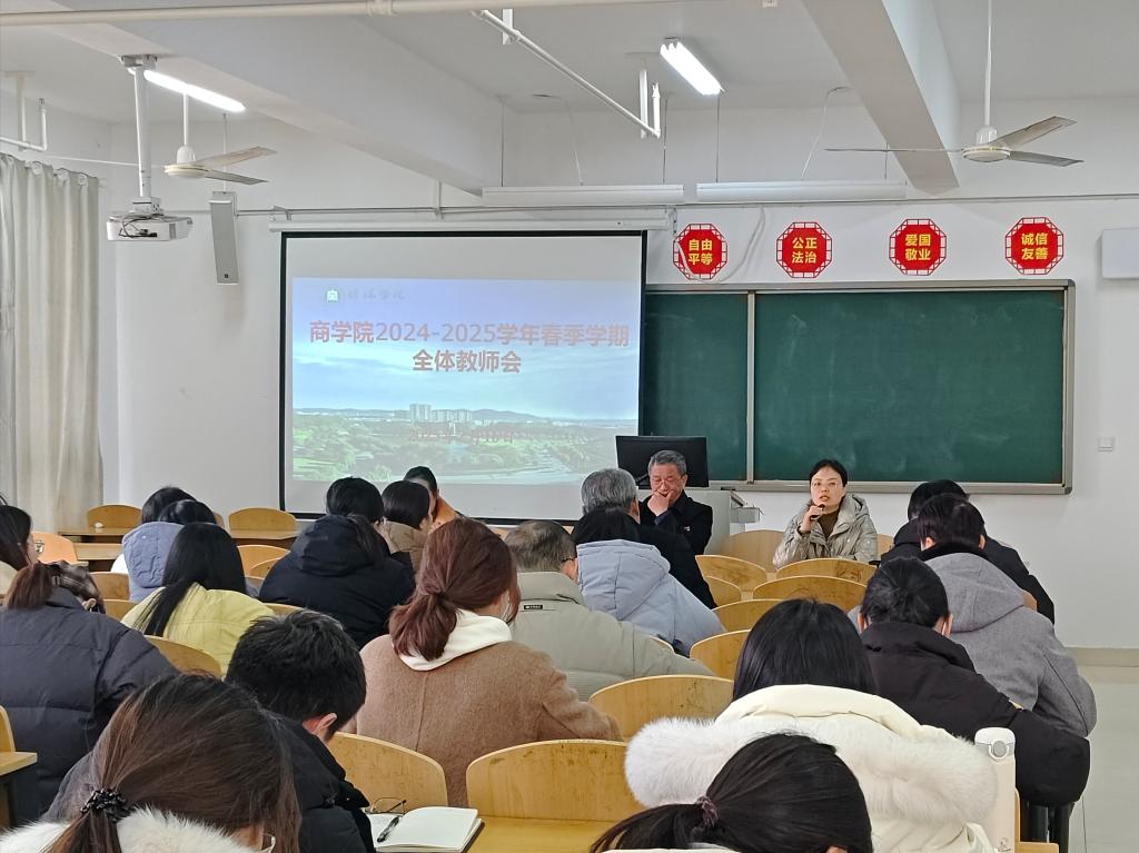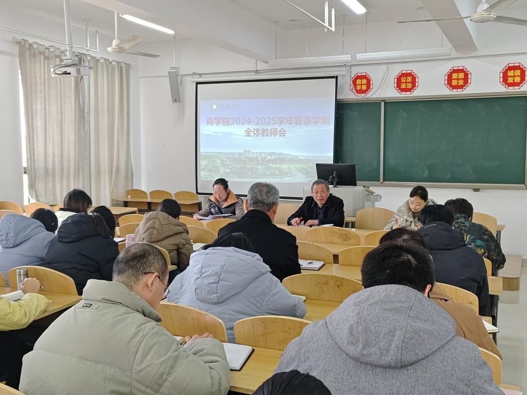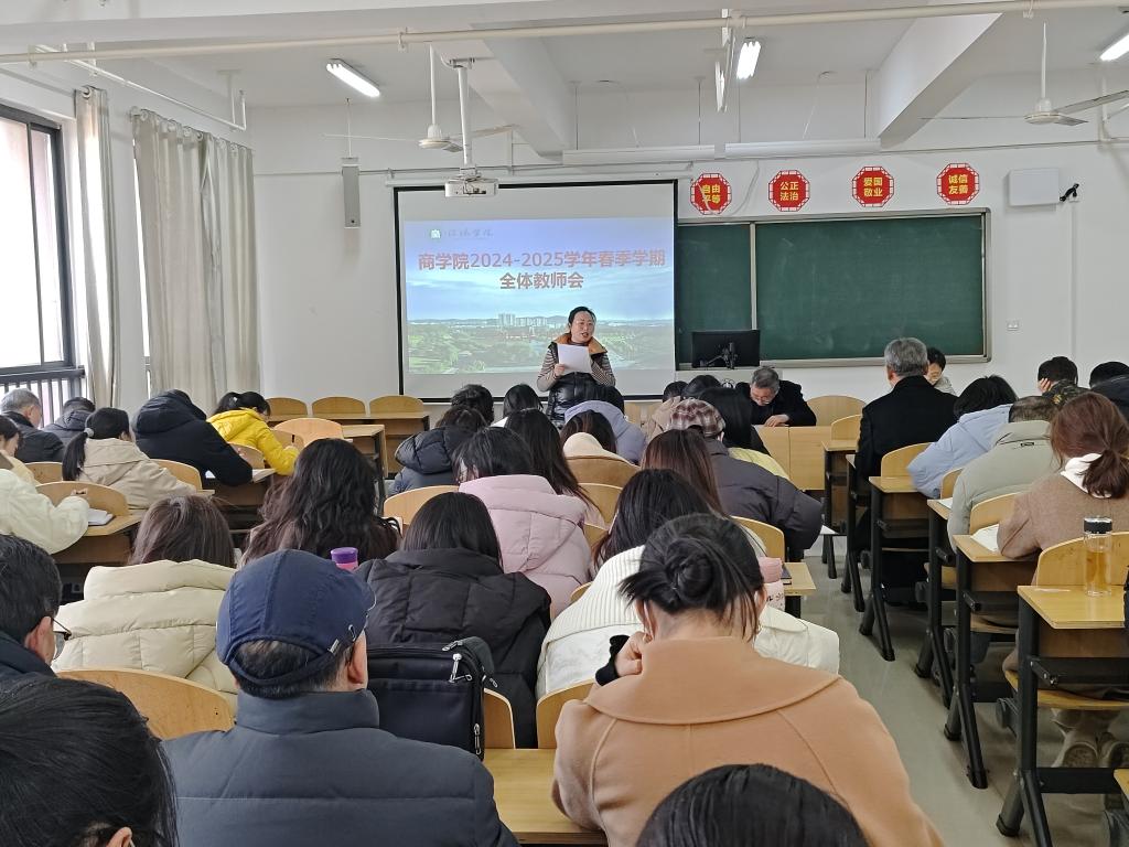 2月16日下午,太阳网集团tcy8722在综合楼608教室召开春季学期全体教师会,安排部署新学期各项工作。太阳网集团tcy8722党总支书记胡秀云、副院长李毓、吴新静、教学秘书盛大俊、学工干事花端阳、行政干事王爱霞及全体教师参加了此次会议。会议由胡秀云主持。