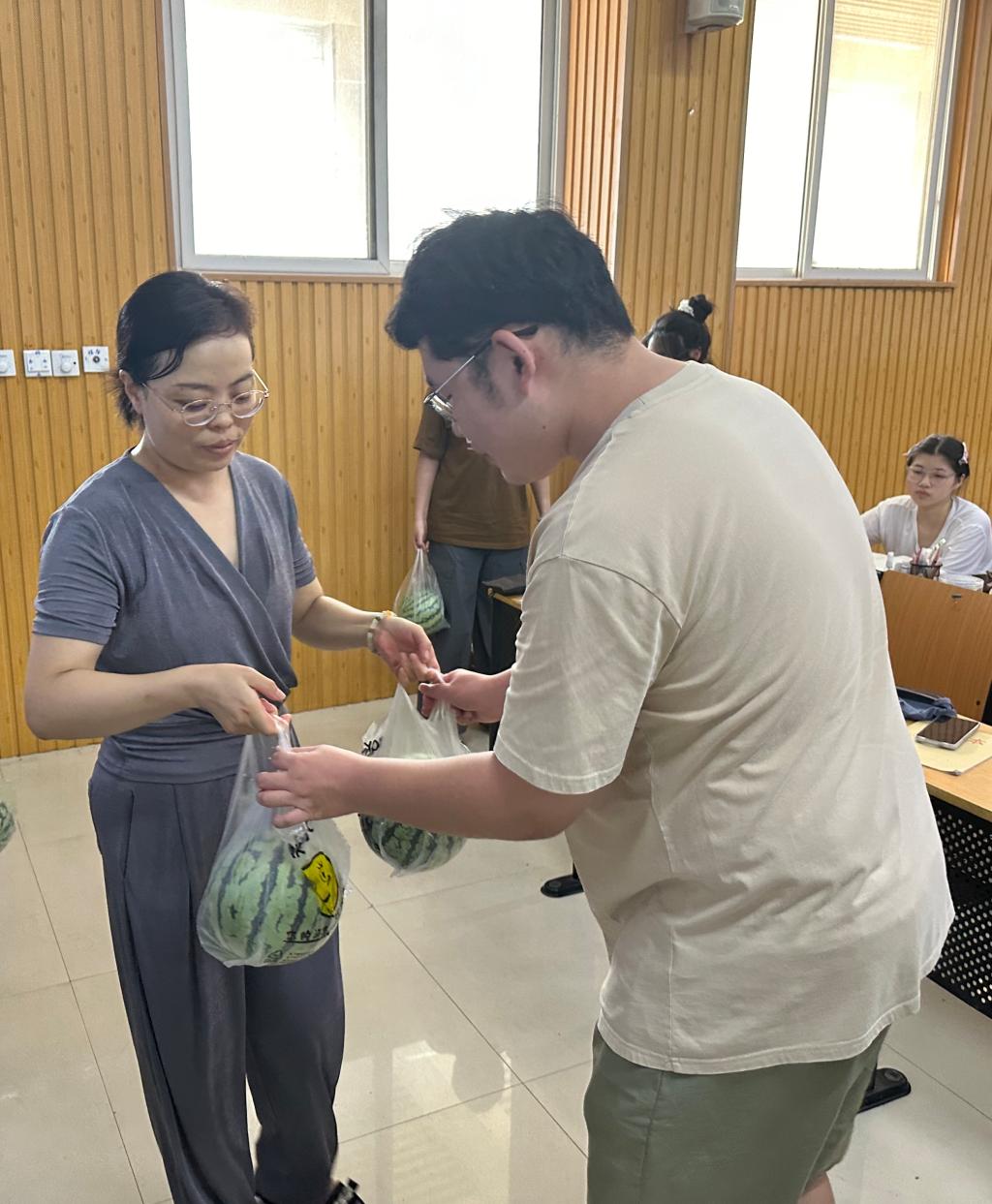 活动最后,领导老师们手捧着一个个饱满多汁、清凉解暑的西瓜,逐一送到考研学子手中。这份裹挟着清甜的“清凉礼包”,承载着学院对学子们的深切关怀与殷切期许,也传递着浓厚的师生情谊。学子们纷纷表示,将把这份关怀转化为冲刺的动力,以更加昂扬的姿态投入备考,力争在考研战场上披荆斩棘,取得优异成绩,为学院增光添彩。
