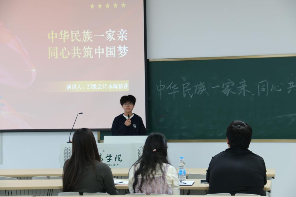 比赛现场,参赛学子紧扣主题,以真挚的情感、流畅的表达,搭配精心制作的PPT,将对“中华民族一家亲”的理解与感悟娓娓道来。他们巧妙引用“感动中国”中各民族携手共进的典型事迹,结合身边不同民族同学互帮互助的鲜活经历与自身感悟,诠释“中华民族一家亲”的丰富内涵,生动展现出各民族同源同脉的文化基因与守望相助的深厚情谊,引发了在场师生的强烈共鸣。
