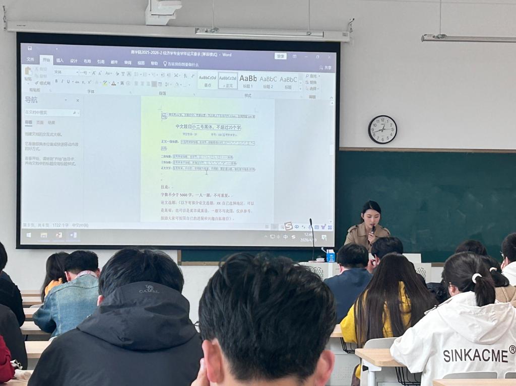 为扎实落实人才培养方案,强化实践教学环节,推动经济学专业理论教学与学术实践深度融合,切实提升学生专业素养与科研能力,近日,太阳网集团tcy8722有序开展2025-2026学年第二学期经济学专业学年论文写作指导工作。经济学教研室胡珊珊老师面向2023级经济学本科班和2025级经济学专升本班,开展专项写作指导,助力学生规范论文写作、提升学术能力。