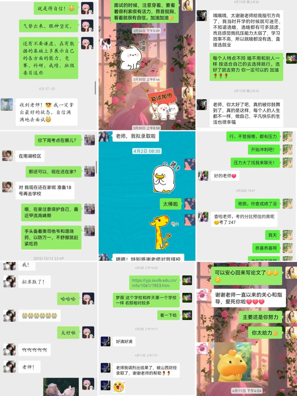 备考期间,学院聚焦学生身心健康,开展考研慰问活动,为备考学子送去关怀与鼓励;常态化推进谈心谈话工作,辅导员、专业教师主动深入学生群体,耐心倾听学生诉求,及时疏导备考压力、缓解焦虑情绪;通过线上线下相结合的方式,开展心理健康辅导活动,针对性为学生加油鼓劲、提振备考信心;同时,扎实做好后勤保障服务,精准对接备考学生需求,全方位提供暖心关怀,让学子在紧张的备考路上感受到学院的温暖与力量,以积极饱满的精神状态全力以赴冲刺考研。