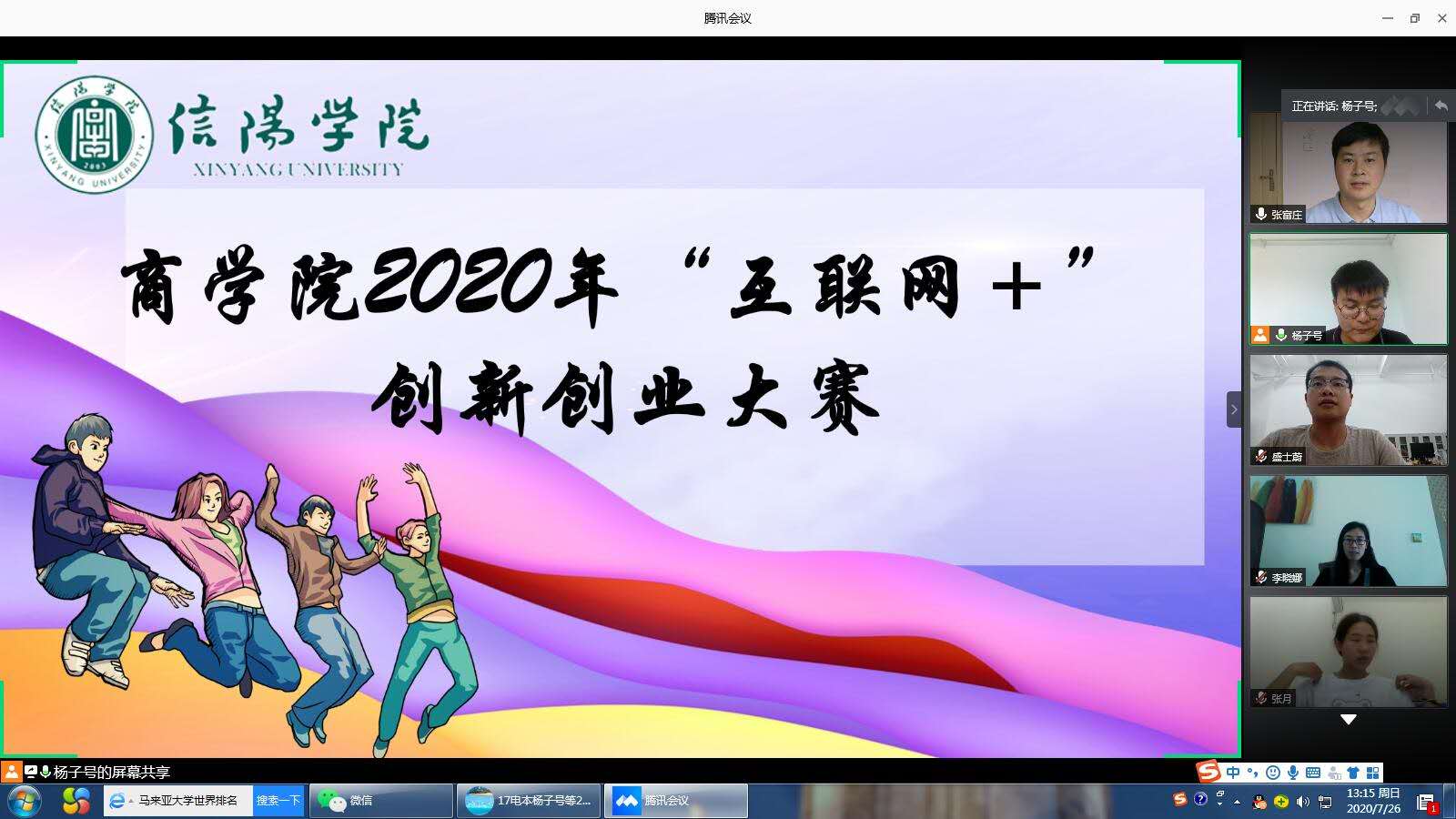 为了选拔并打造优质的学生创新创业项目参赛,营造敢于创新,勇于创业的氛围。太阳网集团tcy8722于7月26日中午在线上举办了第六届“互联网+”大学生创新创业大赛复赛。太阳网集团tcy8722党总支书记张富庄、团总支书记盛士蔚和部分相关专业的教师担任了此次比赛的评委。