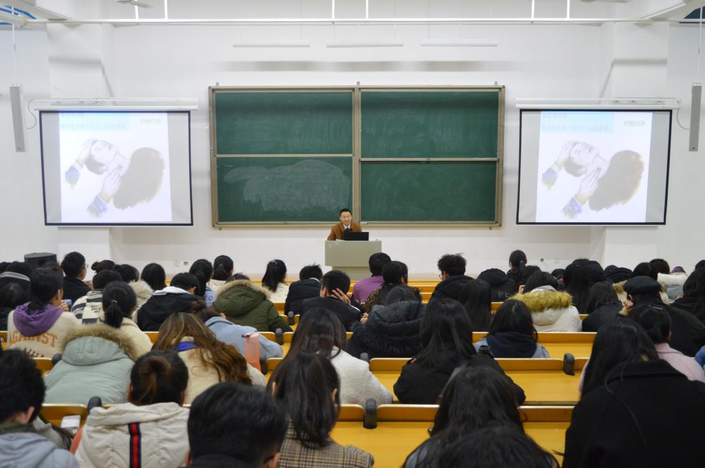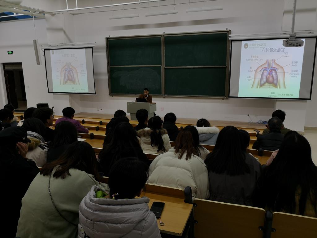 杨贵宝医师从讲述心脏的重要性为切入点,向同学们介绍了心脏临近器官、心脏内部结构、心脏电生理系统、冠状动脉分支等相关专业知识,重点介绍了心肺复苏术(CPR)的具体方法及操作步骤并进行了现场演示。杨贵宝指出心血管疾病是我国居民死亡的首要原因,并强调心血管疾病越来越年轻化,他叮嘱同学们在学习的同时也要注意身体。