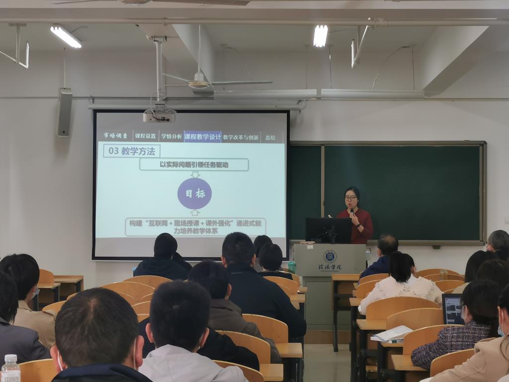 参赛教师在学情调研、课程研究、教学大纲设计和人才培养方案的基础上,从“说教学目标”、“说教学重难点”、“说教学方法”、“说学情学法”、“说教学过程”、“说课程思政”、“说课程特色”等方面进行说课,以精彩的课堂设计、沉稳从容的讲授、条理清晰的授课赢得评委和观摩教师的热烈掌声。