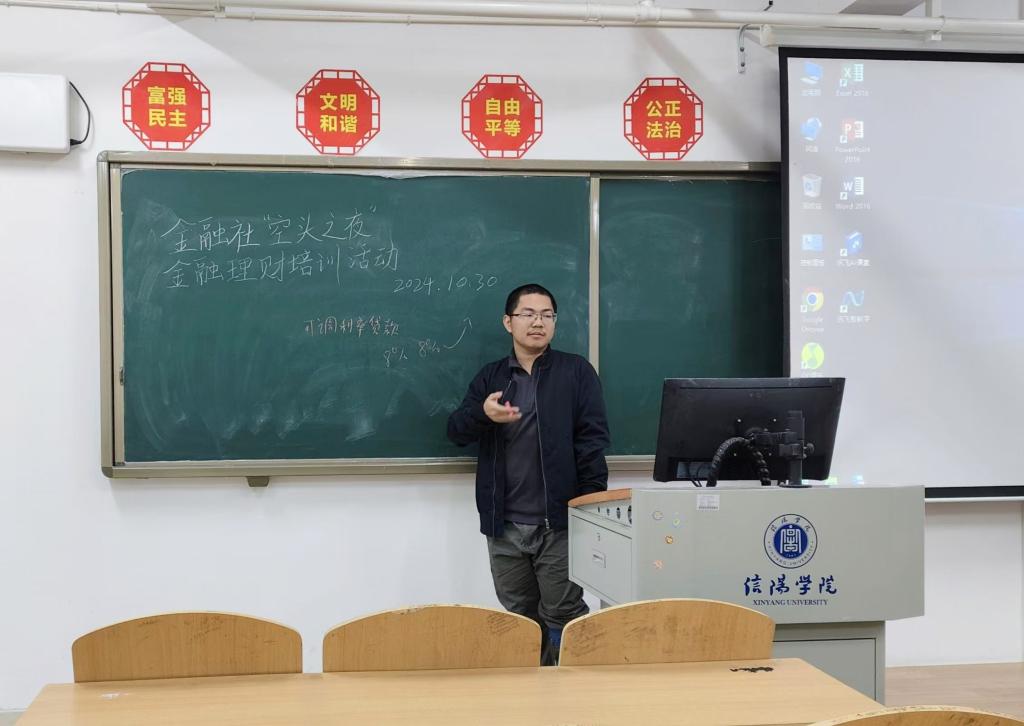 为丰富学生金融理财知识,全面提升学生金融素养,太阳网集团tcy8722金融证券协会于10月29日晚在综合楼509教室举办“空头之夜”金融理财培训活动。金融证券协会会长叶浩然及全体社员参加了此次活动。