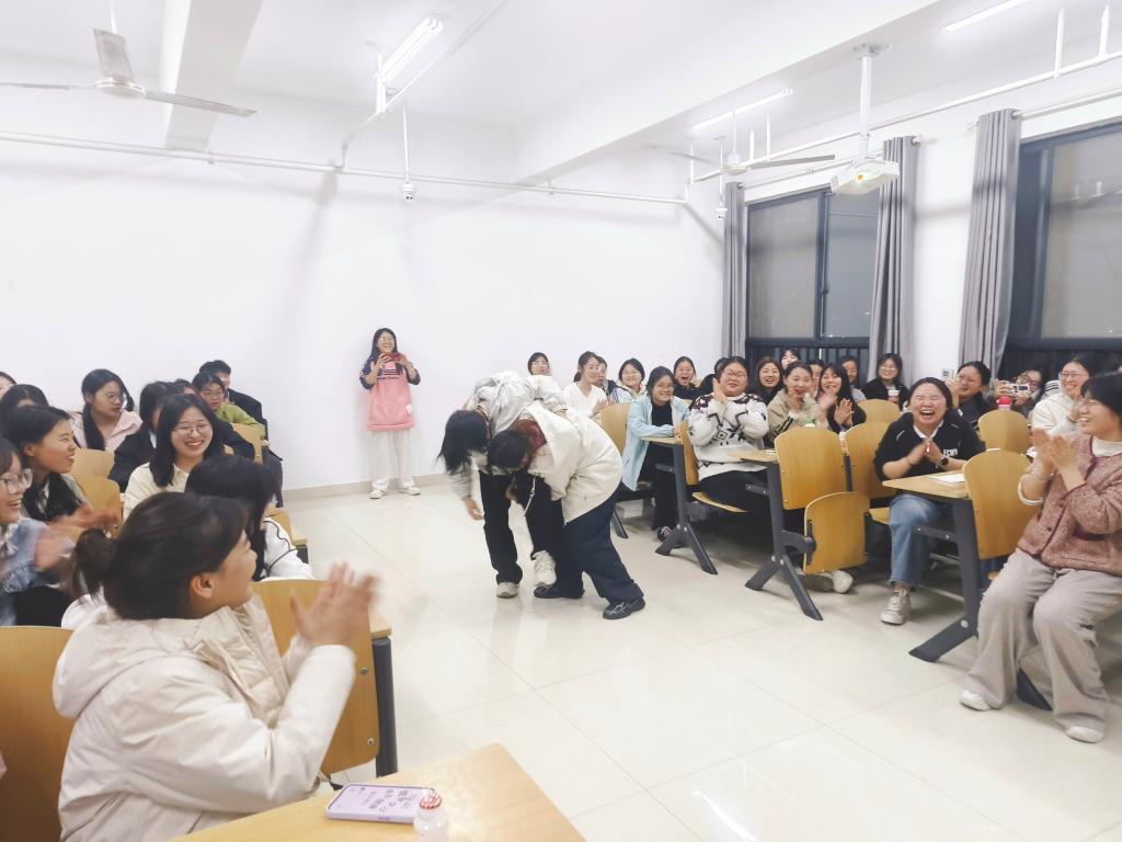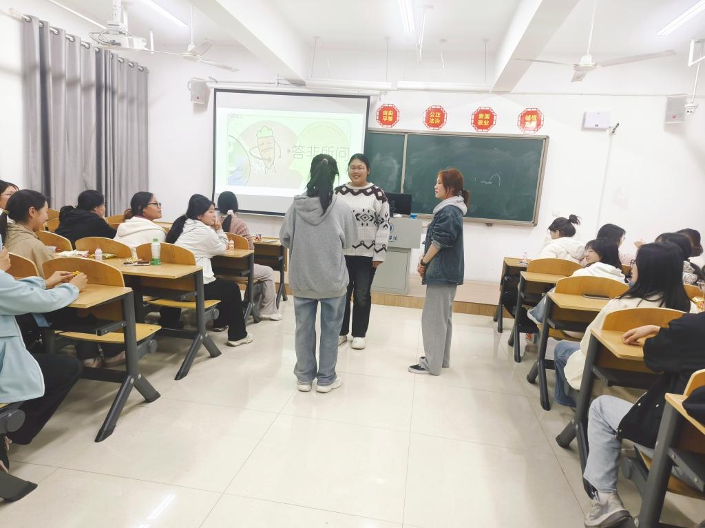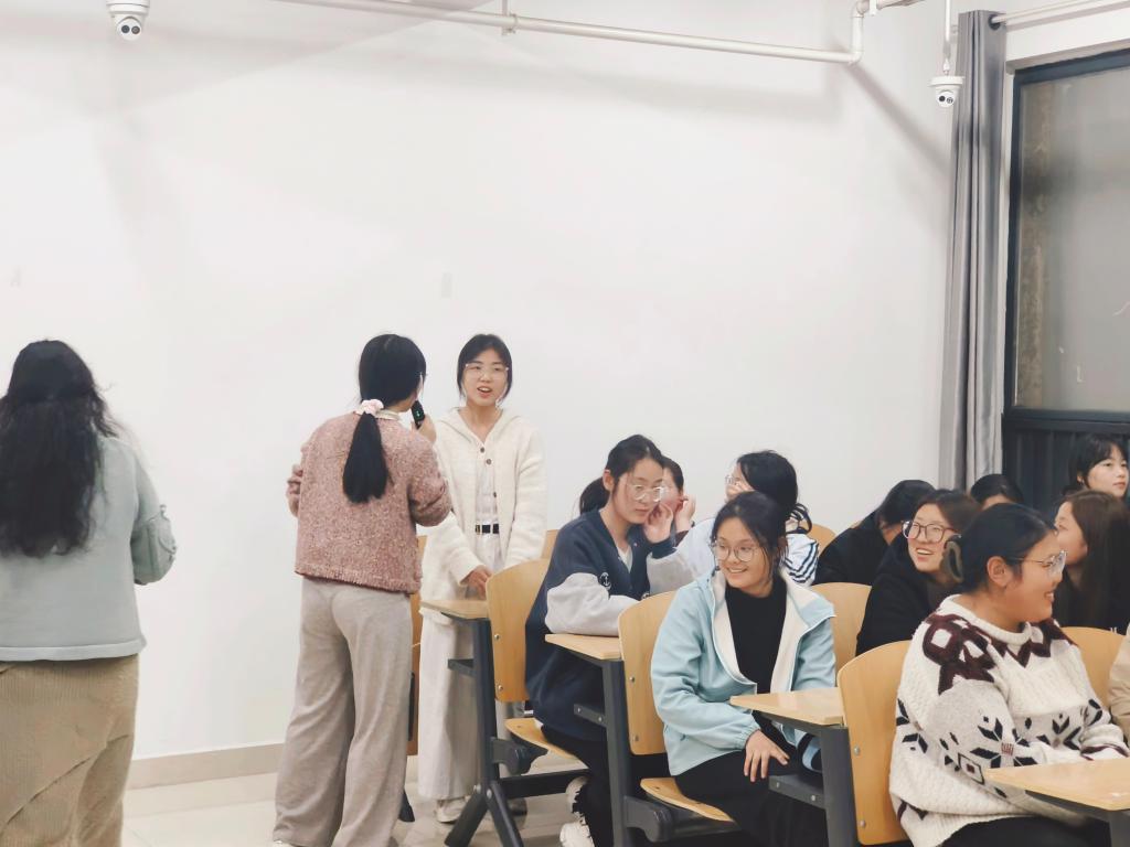 随着“你画我猜”与“答非所问”环节的展开,活动进入情感共振的高潮。同学们在惊叹于彼此思维敏捷的同时,也不忘对在游戏中出错的同学施以有趣的惩罚。那些落落大方的自我介绍以及充满趣味的“大冒险”互动环节,不仅为同学们创造了展现自我的机会,更有力地促进了同学们之间的深度了解。一位参与者在自我介绍时兴奋地分享道:“我特别喜欢这种类型的团辅活动,一方面,它让我结识了班里更多的同学,拓展了我的社交圈;另一方面,这也是一个很好的释放压力的契机。我尤其期待能在这些趣味盎然的活动中,不断实现自我欣赏与自我锻炼。”